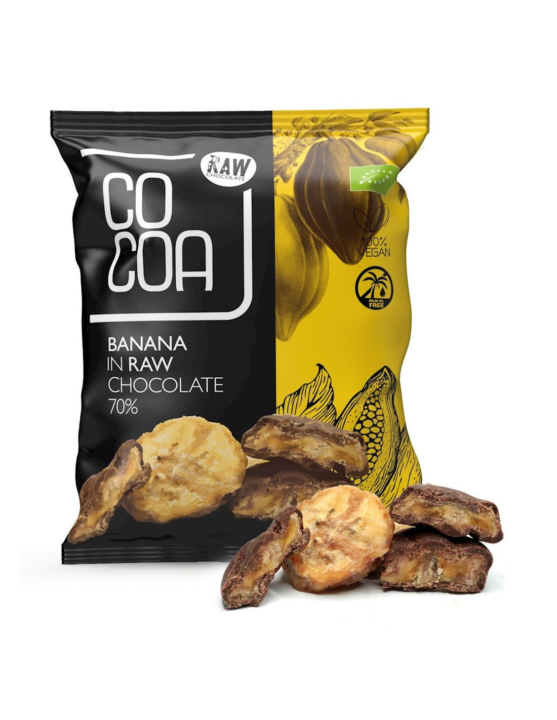 COCOA (czekolady i bakalie w surowej czekoladzie)Peruwiańskie suszone banany oblane surową czekoladą.