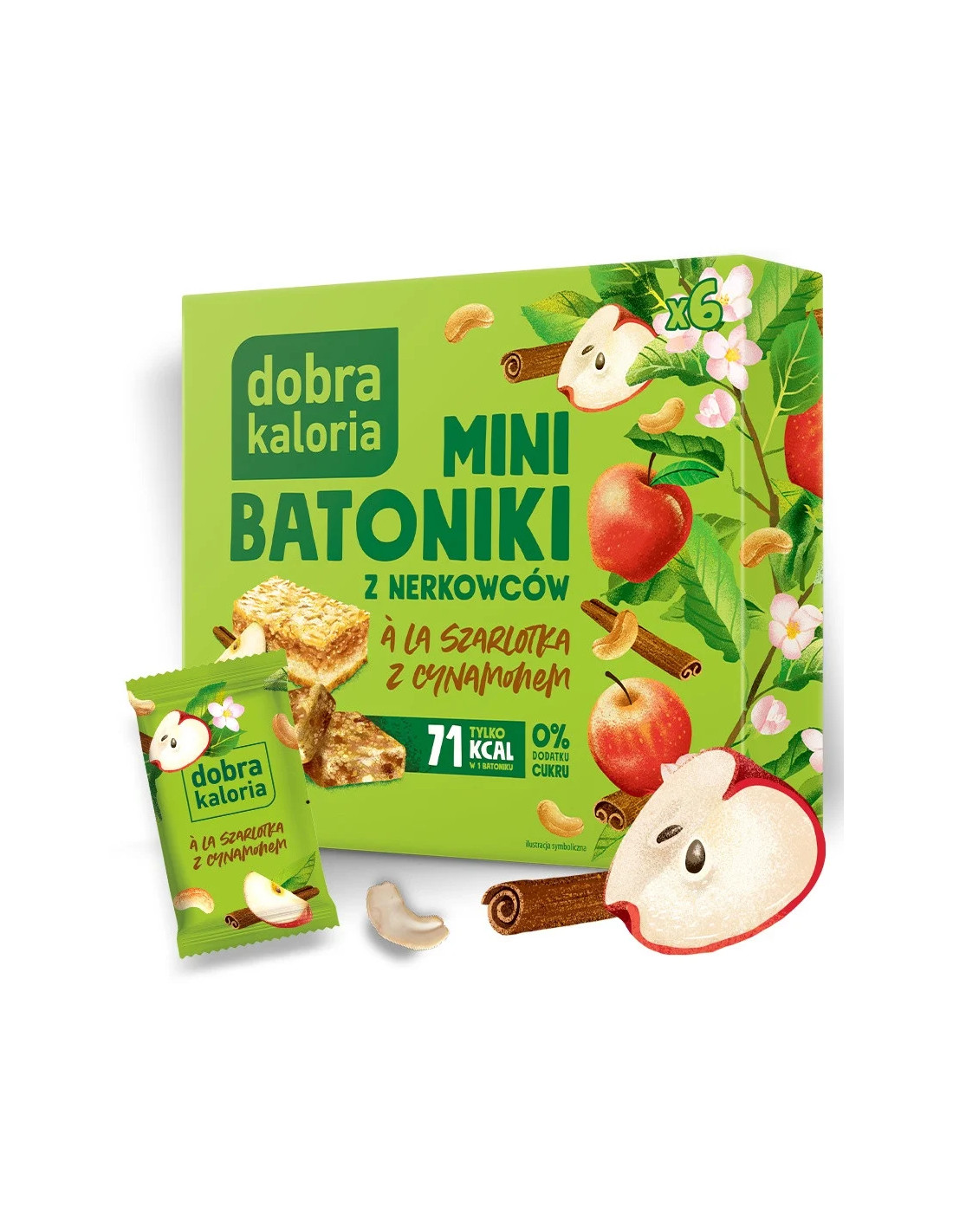 DOBRA KALORIA (batony, produkty śniad. i wege)Batoniki orzechowe z jabłkami i cynamonem Składniki: orzechy nerkowca (33 %), rodzynki, pasta daktylowa, jabłka suszone (10 %) (zawierają siarczyny), orzechy nerkowca prażone (5 %), chrupki komosowe (komosa ryżowa, błonnik z cykorii, zagęszczony sok jabłkowy), cynamon (0,6 %). Produkt może zawierać inne orzechy, orzeszki ziemne, nasiona sezamu, zboża zawierające gluten oraz pestki owoców lub ich fragmenty. Bez dodatku cukrów. Zawiera naturalnie występujące cukry. Opakowanie zawiera 6 batoników.