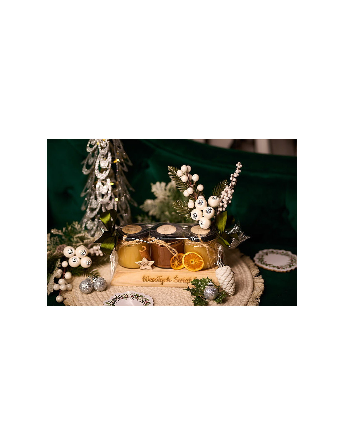 Świąteczna wstążka (kolor może być inny w zależności od dostępności) oraz naturalne dodatki, suszone pomarańcze, i ozdoby świąteczne.