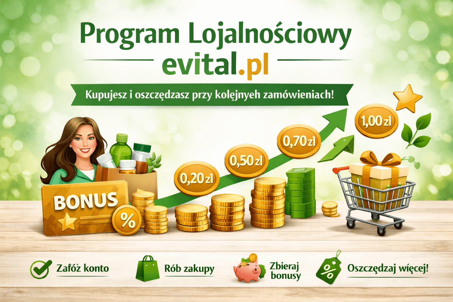 Program Lojalnościowy evital.pl to bezpłatny program dla zarejestrowanych klientów, w którym za zakupy przyznawane są bonusy rabatowe wyrażone kwotowo w złotówkach, możliwe do wykorzystania przy kolejnych zamówieniach.