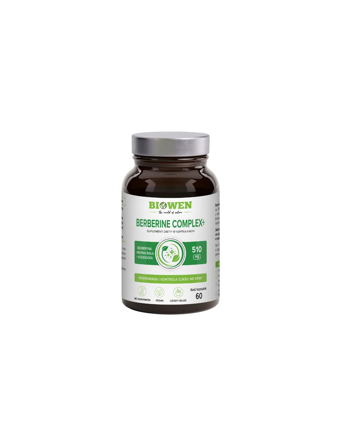 BiowenPojemność: 60 kapsułek Ekstrakt z korzenia berberysu standaryzowany na 97% chlorowodorku berberyny [DER 60:1] – 450 mg berberyny w kapsułce Ekstrakt z kozieradki standaryzowany na 60% galaktomannanu (Fenumannans®) [DER 4:1] – 30 mg Ekstrakt z morwy białej DER 10:1 – 30 mg Hydroksypropylometyloceluloza (otoczka kapsułki) Masa netto: 30,6 g.