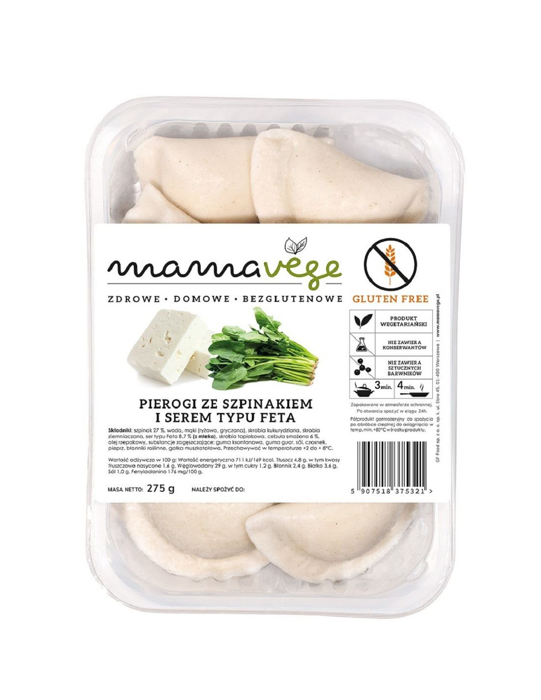 PIEROGI ZE SZPINAKIEM I SEREM TYPU FETA BEZGLUTENOWE 275 g - MAMA VEGE