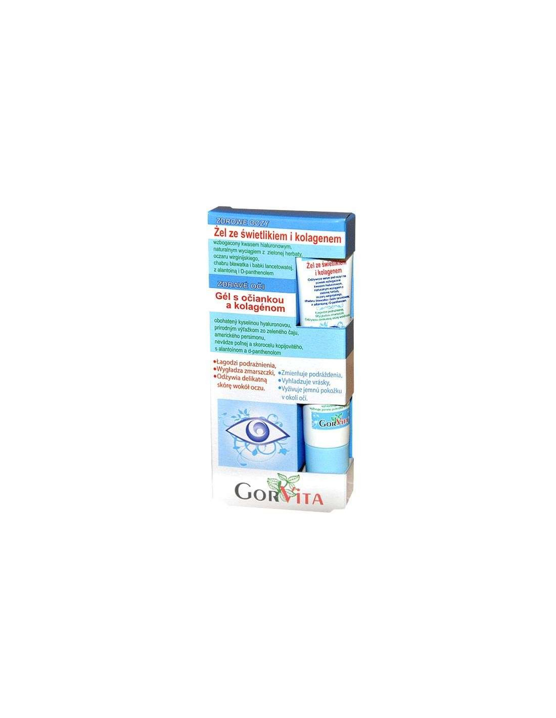 GORVITA PPHUŻel ze świetlikiem i kolagenem – odżywcza formuła bogata w kwas hialuronowy, naturalny wyciąg z zielonej herbaty, oczaru wirgilijskiego, chabru, bławatka i babki lancetowatej z alantoiną i D-panthenolem. Polecany do codziennej pielęgnacji skóry okolic oczu oraz powiek.