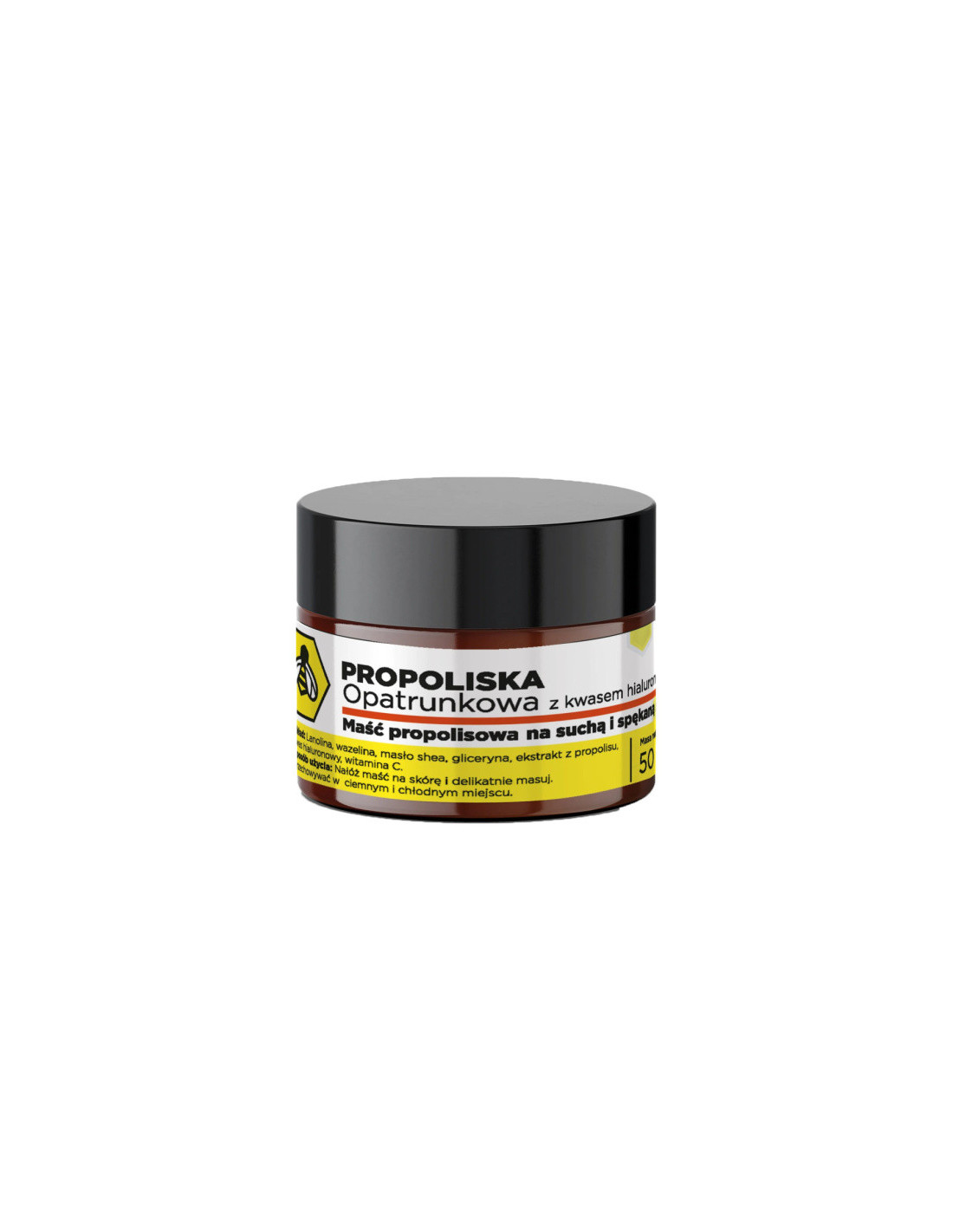 Skład: Lanolina, wazelina, masło shea, ekstrakt z propolisu, kwas hialuronowy, witamina C