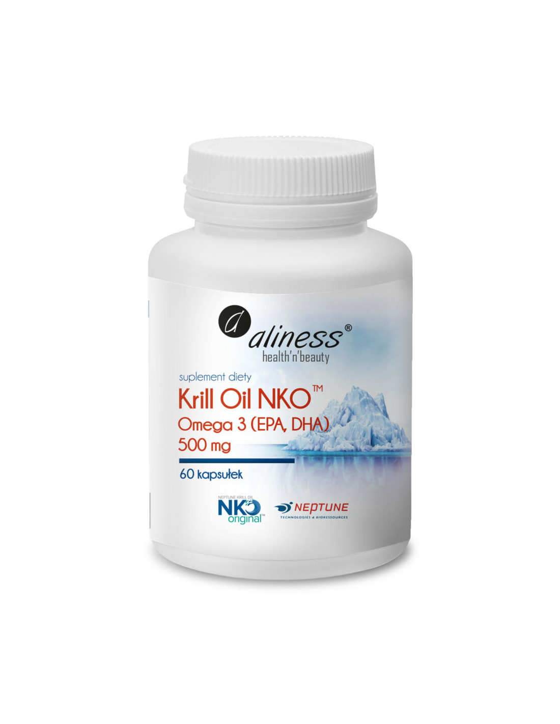 MedicalineSkładniki 1 kapsułka 2 kapsułki (porcja dzienna) Olej z kryla NKO™ (Euphausia superba) 500 mg 1000 mg – w tym: Fosfolipidy 210 mg 420 mg Kwasy omega-3, w tym: 150 mg 300 mg – EPA 72,5 mg 145 mg – DHA 42,5 mg 85 mg Kwasy omega-9 32,5 mg 65 mg Cholina 25 mg 50 mg Kwasy omega-6 7,3 mg 14,6 mg Astaksantyna 500 µg 1000 µg Składniki: olej z Kryla Neptune NKO™ (Euphausia superba), żelatyna rybia, substancja utrzymująca wilgoć: glicerol. lej z Kryla NKO™ stanowi bogate źródło kwasów tłuszczowych omega-3 (EPA i DHA), które wspierają serce, mózg i prawidłowe widzenie. Naturalna astaksantyna działa jako antyoksydant, chroniąc komórki przed stresem oksydacyjnym i wspierając ogólną witalność organizmu. Korzystne działanie występuje w przypadku spożywania 250 mg EPA i DHA dziennie.