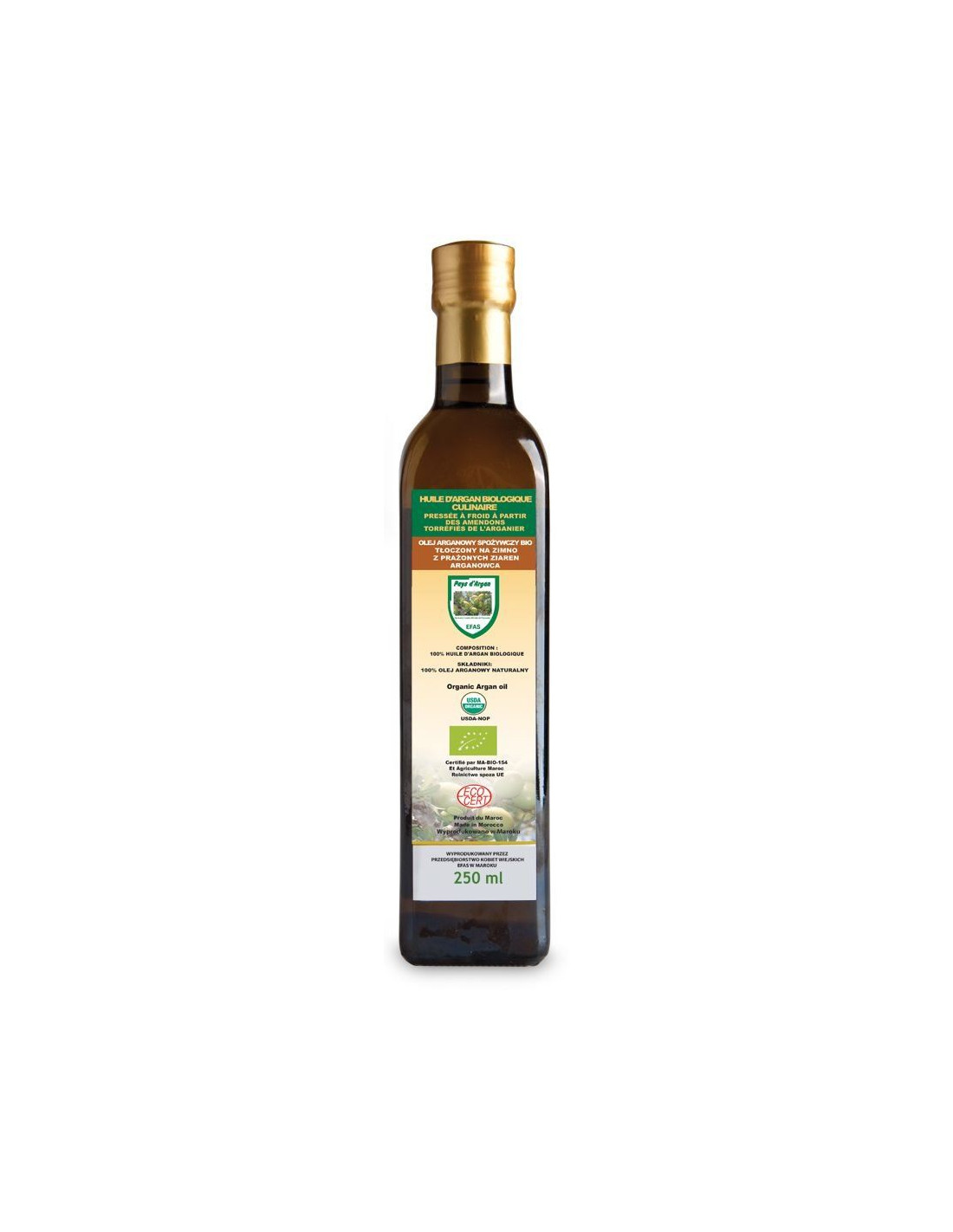 Olej arganowy powstaje z nasion drzew arganowych, które występują wyłącznie w południowo-zachodniej części Maroka. Warunkiem prawidłowej uprawy drzew arganowych jest nieskazitelnie czyste środowisko. Powstaje w kilku etapach: po zebraniu owoców następuje prażenie i mielenie ich ziaren w małych prasach. W wyniku tego powstaje oleista pasta, z której ręcznie wyciskany jest olej arganowy. Na koniec poddawany jest on wielokrotnej filtracji.