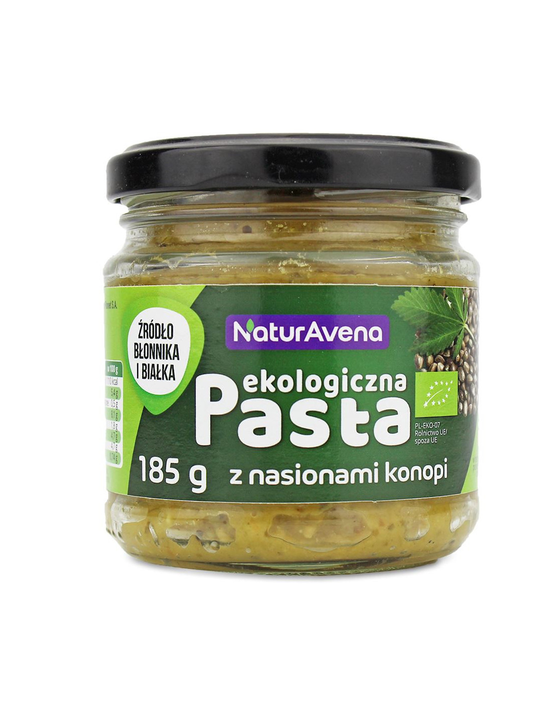 Pasta z ciecierzycy i szpinaku z nasionami konopi idealnie nadaje się do smarowania pieczywa. Produkt sterylizowany.