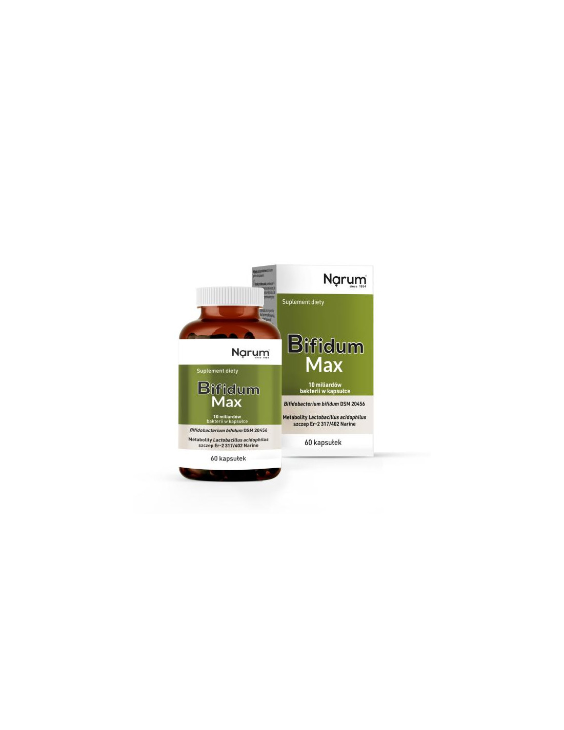 Suplement diety Bifidum Max w kapsułkach dla dorosłych i dzieci od 3. roku życia zawiera szczep Bifidobacterium bifidum DSM 20456 oraz metabolity bakterii Lactobacillus acidophilus szczep Er-2 317/402 Narine. Składniki: Bifidobacterium bifidum DSM 20456, metabolity bakterii Lactobacillus acidophilus szczep Er-2 317/402 Narine, otoczka kapsułki (substancja glazurująca: hydroksypropylometyloceluloza, substancja żelująca: guma gellan). Zalecana dzienna porcja do spożycia: Dorośli i osoby powyżej 12 lat: od 1 do 3 kapsułek Dzieci od 6 do 12 lat: od 1 do 2 kapsułek Dzieci od 3 do 6 lat: 1 kapsułka