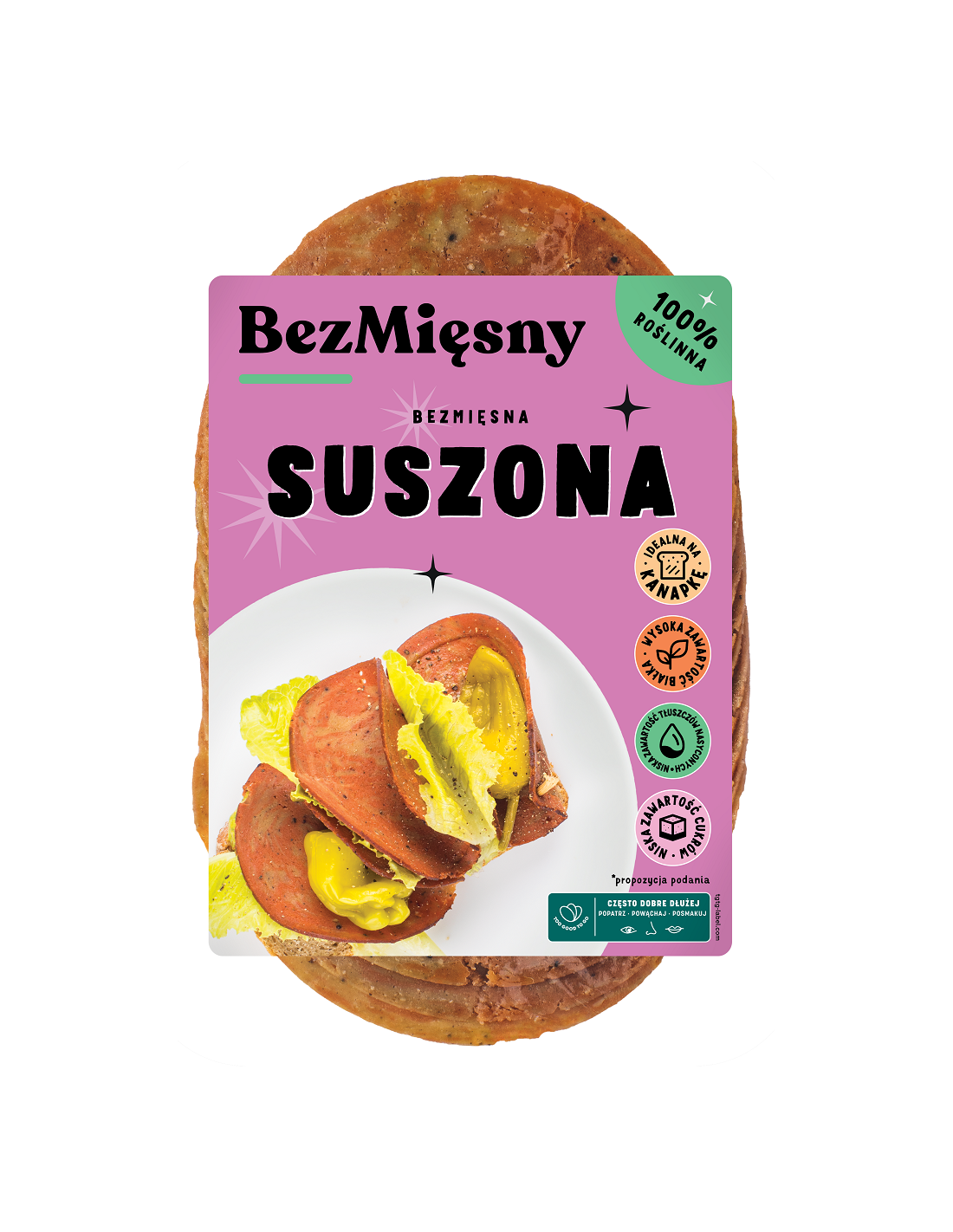 Roślinny zamiennik kiełbasy podsuszonej w plastrach. Produkt roślinny na bazie białka pszennego.