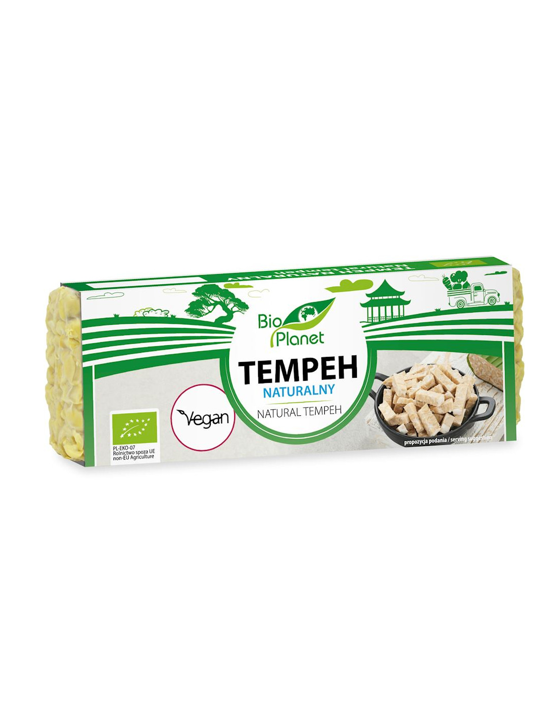 Tempeh naturalny to fermentowany, wysokobiałkowy produkt SOJOWY o orzechowo-grzybowym aromacie. Polecamy do smażenia, gotowania, pieczenia i dań na zimno. Stanowi źródło magnezu, żelaza i wapnia. Na tempehu mogą występować czarne plamki, jest to naturalny proces dojrzewania produktu.