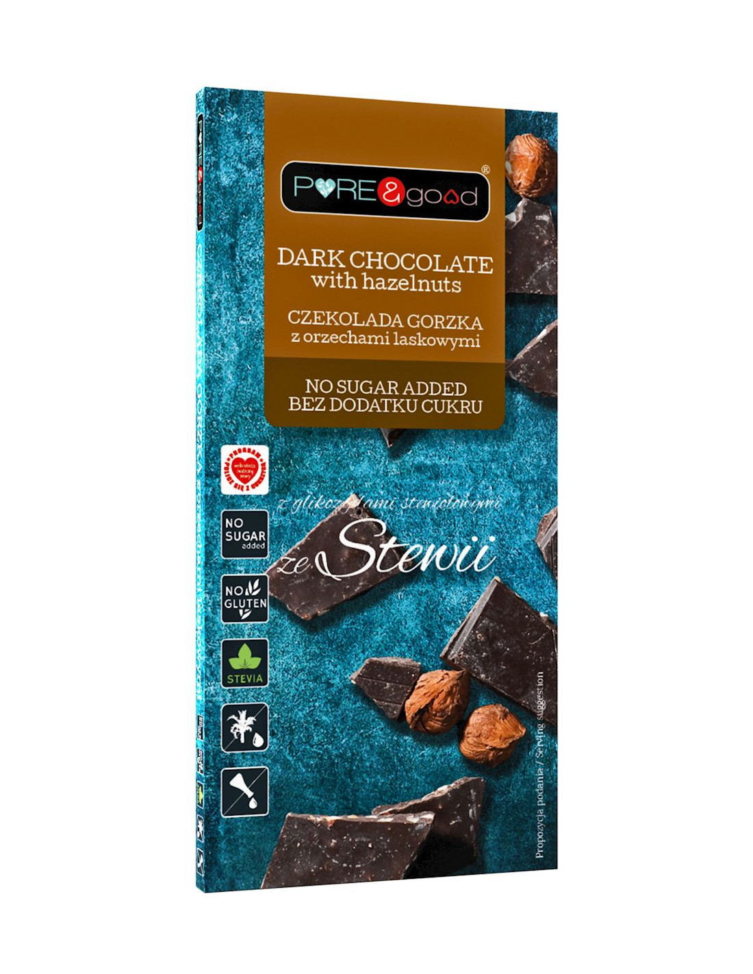 Podobnie jak pozostałe czekolady z serii Pure&good, czekolada z orzechami laskowymi słodzona jest stewią i nie zawiera glutenu oraz oleju palmowego.