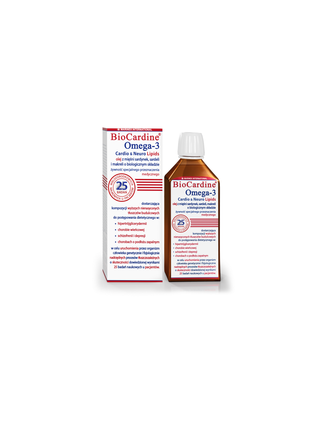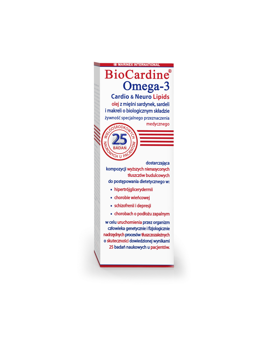 BioCardine®Omega-3 (żspm) jest chronionym europejskim patentem, połączeniem olejów z mięśni sardynek, sardeli i makreli, Południowy Ocean Spokojny. Naturalny i niemodyfikowany, biologicznie aktywny jest naturalnym źródłem kompozycji wyższych kwasów tłuszczowych, głównie nnkt* EPA, DPA, DHA omega-3 w postaci trójglicerydów, niezbędnych mózgowi i układowi nerwowemu, sercu i układowi krążenia, systemowi przeciwzapalnemu, do uzyskania genetyczno-fizjologicznej budowy i działania. W czasie zaburzeń i chorób zapotrzebowanie organizmu człowieka na ten rodzaj tłuszczów znacząco wzrasta dlatego jak wykazało 25 wieloośrodkowych i wielokierunkowych badań naukowych przeprowadzonych u pacjentów, BioCardine®Omega-3 (żspm) przeznaczony jest do postępowania dietetycznego w niedożywieniu organizmu człowieka wyższymi kwasami tłuszczowymi równolegle z leczeniem: choroby wieńcowej, schizofrenii, depresji.
