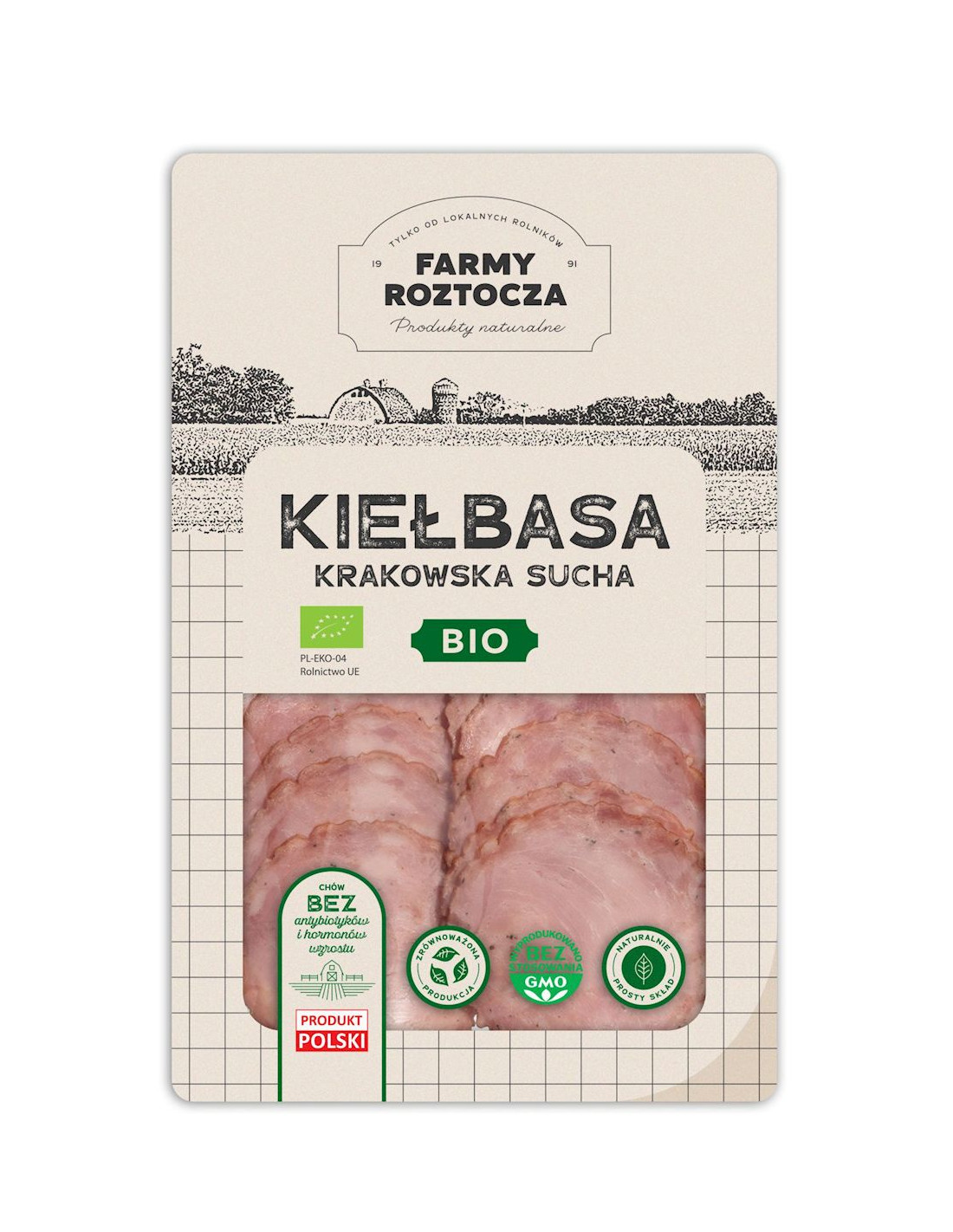KIEŁBASA KRAKOWSKA SUCHA PLASTRY BIO 80 g - FARMY ROZTOCZA (Z PÓŁKI)