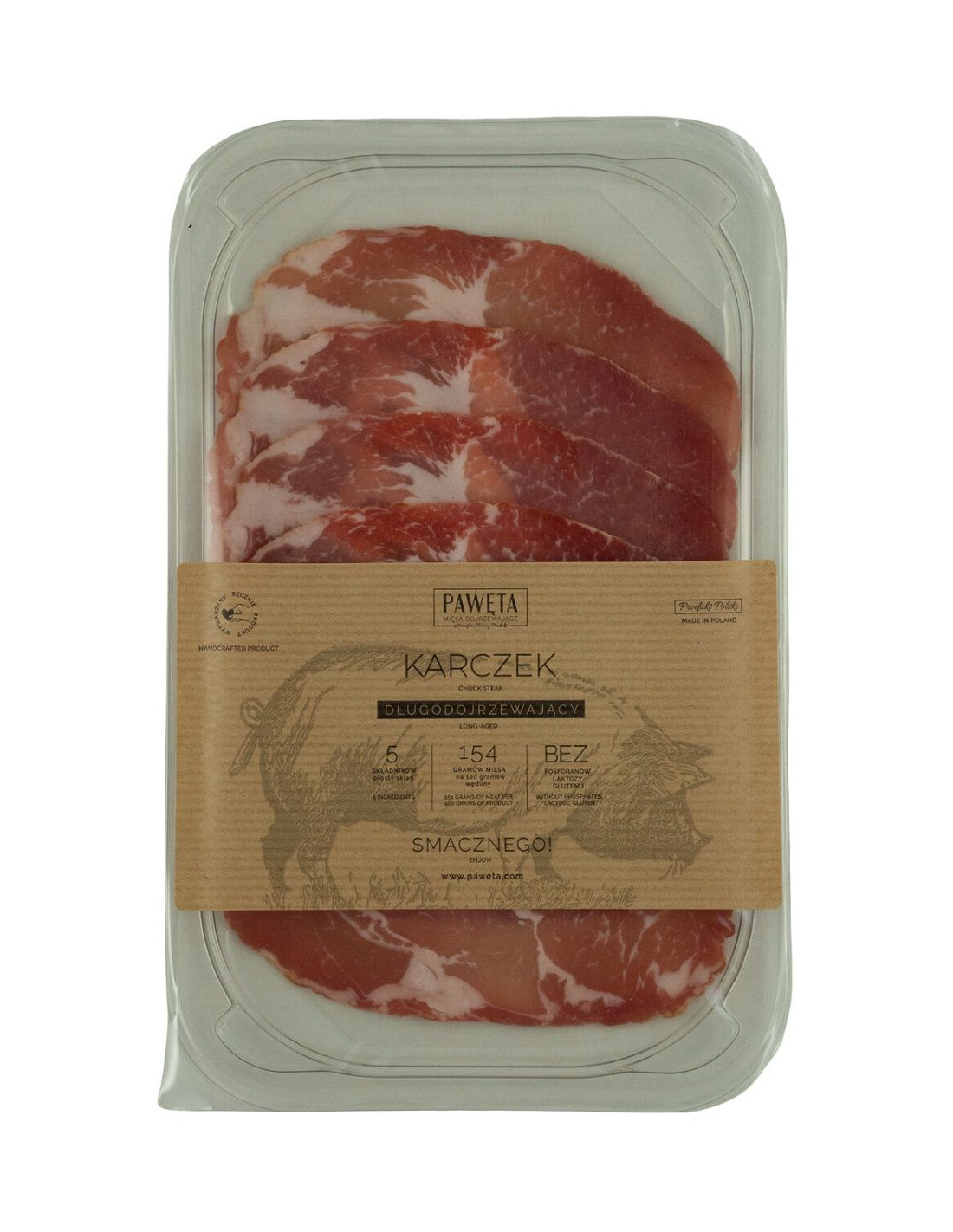 Poznaj niezwykły smak karczku wieprzowego dojrzewającego PAWĘTA – starannie przygotowany, aromatyczny i soczysty, idealny dla miłośników wysokiej jakości wędlin. Wygodne opakowanie 65 g z funkcją otwórz/zamknij sprawia, że plastry są łatwe do serwowania i zachowują pełnię smaku. Doskonały na kanapki, sałatki czy eleganckie przystawki, wnosząc do potraw głębię i wyrafinowany aromat.