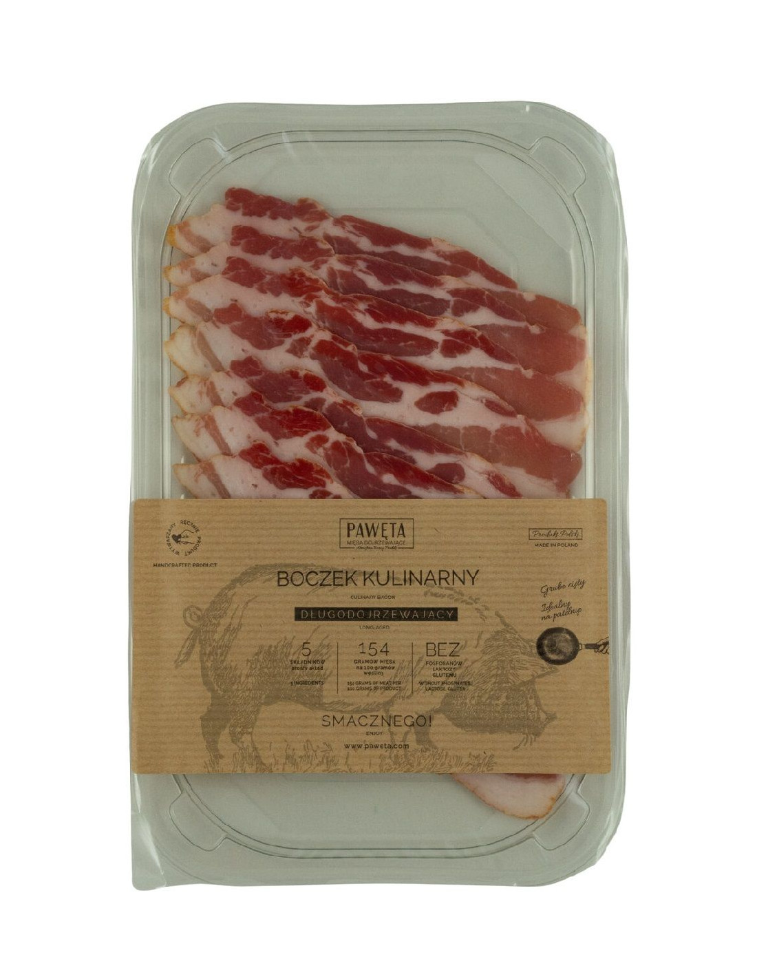Boczek kulinarny dojrzewający PAWĘTA to wyjątkowy produkt o intensywnym smaku i delikatnej, aksamitnej strukturze. Grubsze plastry są idealne na patelnię, a opakowanie 65 g z funkcją otwórz/zamknij umożliwia łatwe użycie i zachowanie aromatu. Doskonały do smażenia, duszenia czy jako wykwintny dodatek do sałatek i dań głównych, wprowadzając głębię smaku i luksusowy charakter do każdej potrawy.