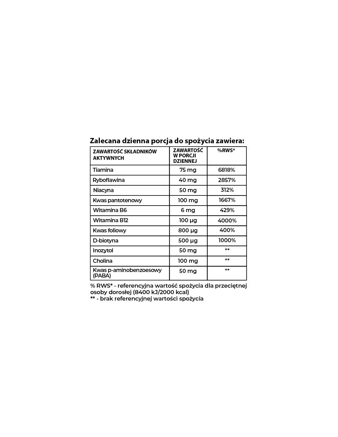 Składniki/ingredients: cholina (wodorowinian choliny), kwas pantotenowy (D-pantotenian wapnia), hydroksypropylometyloceluloza (otoczka kapsułki), tiamina (chlorowodorek tiaminy), inozytol, niacyna (amid kwasu nikotynowego), kwas p-aminobenzoesowy, ryboflawina (ryboflawina), witamina B12 (metylokobalamina), witamina B6 (pirydoksalo-5-fosforan), maltodekstryna, kwas foliowy (sól glukozaminowa kwasu (6S)-5 metylotetrahydrofoliowego), biotyna (D-biotyna).