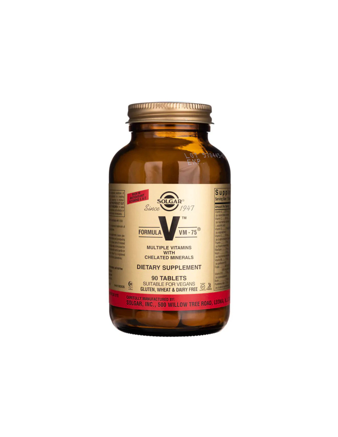 Wartości odżywcze: Solgar Formuła VM-75 (90 tab) zawartość w porcji: 1 tabletka RWS% Witamina C (kwas L-askorbionowy) 250mg 313% Witamina E (75 IU, bursztynian D-alfa-tokoferylu) 100mg 833% Witamina B6 (chlorowodorek pirydoksyny) 75mg 5357% Witamina B1 (monoazotan tiaminy) 75mg 6818% Kwas pantotenowy (witamina B5, D-pantotenian wapnia) 75mg 1250% Witamina B2 ( ryboflawina) 75mg 5357% Niacyna (witamina B3, amid kwasu nikotynowego) 75mg 469% Inozytol 75mg --- Cholina (dwuwinian) 31mg --- Chlorowodorek Betainy 25mg --- Bioflawonoidy cytrusowe kompleks 25mg --- Rutyna 25mg --- Wapń (diglicynian wapnia†,węglan wapnia) 20mg 3% Magnez (diglicynian† magnezu, tlenek magnezu) 10mg 3% Cynk (diglicynian†cynku, tlenek cynku) 10mg 100% Betakaroten naturalnego pochodzenia w tym: 4,5mg --- - inne karetonoidy 12µg --- Hesperydyna 5mg --- Sproszkowana baza ziołowa (lucerna, wyciąg z aceroli, krasnorosty, pietruszka, rzeżucha, dzika róża) 4mg --- Żelazo (diglicynian żelaza (II) 1,3mg 9% Mangan (diglicynian manganu) 1mg 50% Bor (boran sodu, kwas cytrynowy) 0,5mg --- Miedź (diglicynian miedzi) 1000ug 100% Folian (kwas foliowy - kwas pteroilomonoglutaminowy) 400µg 200% Sproszkowane krasnorosty – zawartość jodu 150µg 100% Biotyna (d-biotyna) 75µg 150% Witamina B12(cyjanokobalamina) 75µg 3000% Selen (L-selenometionina) 25µg 45% Chrom (pikolinian chromu) 25µg 63% Witamina D (200IU, ergokalcyferol) 10µg 200% *RWS – Referencyjna Wartość Spożycia ***RWS – Referencyjna Wartość Spożycia nie ustalona