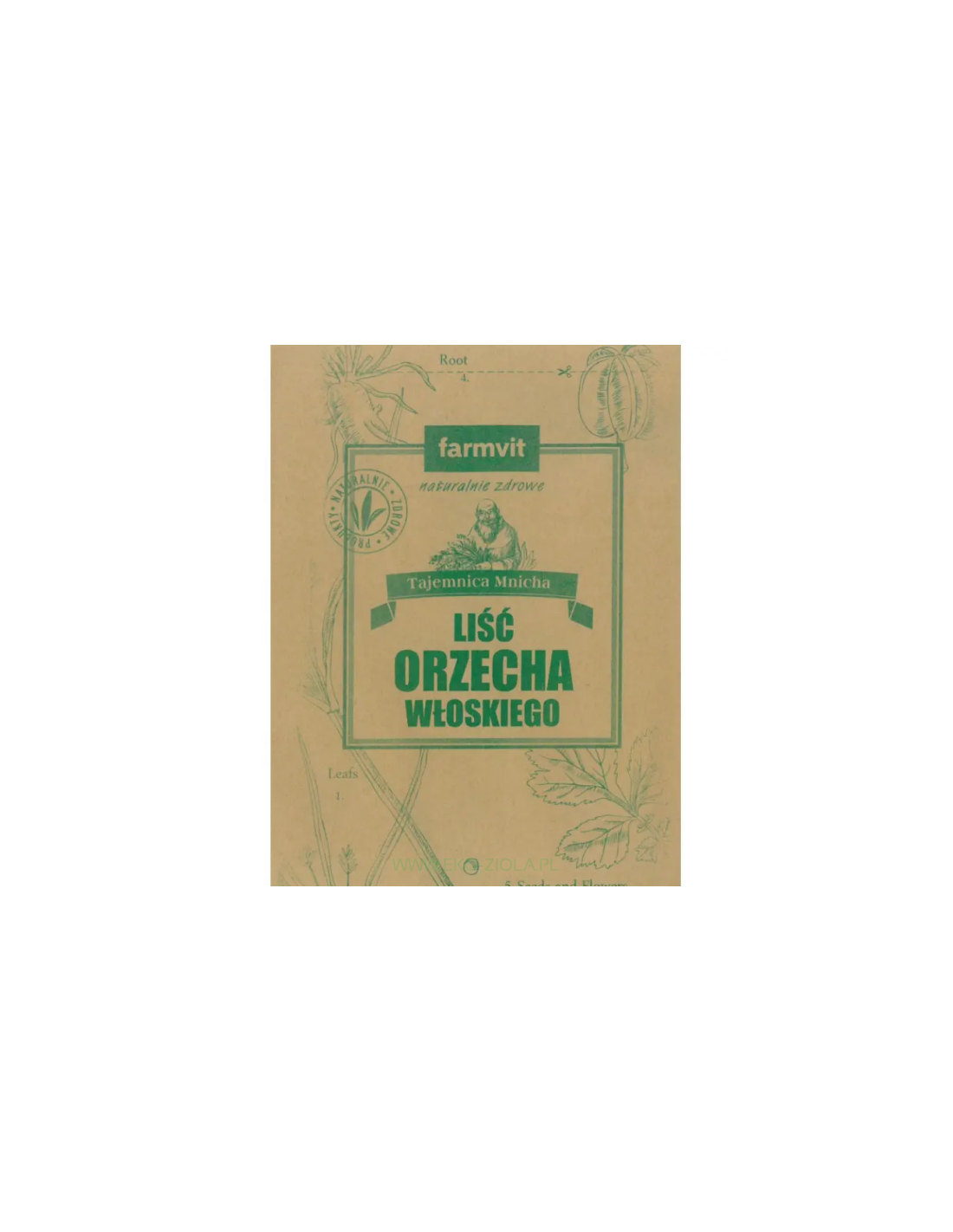 farmvitSkładniki: liść orzecha włoskiego Sposób użycia: 1 łyżkę rozdrobnionych liści orzecha zalać szklanką wrzącej wody, pozostawić pod przykryciem do zaparzenia na 10 minut. Stosować zewnętrznie do okładów na skórę. Sposób przechowywania: Przechowywać w temperaturze pokojowej, w suchym miejscu, w sposób niedostępny dla małych dzieci. Chronić przed wilgocią i światłem.