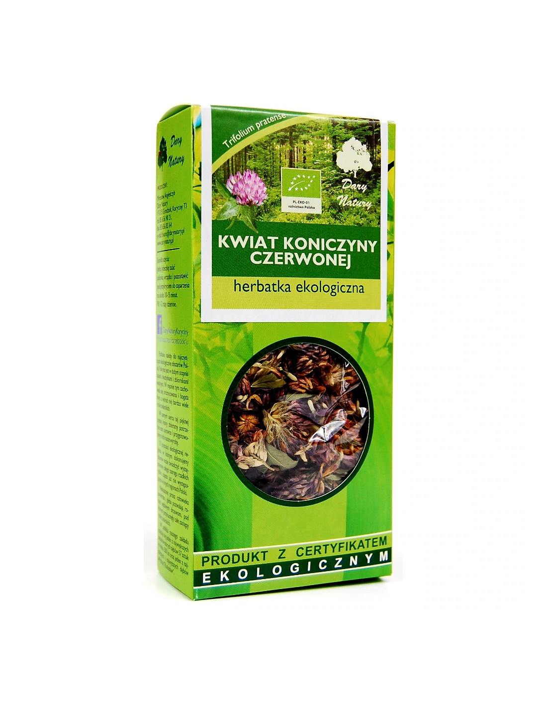 Kwiaty czerwonej koniczyny znane są ze swojego korzystnego wpływu na kobiecy organizm. Pomagają radzić sobie z objawami związanymi z menopauzą, takimi jak uderzenia gorąca, pocenie się i niepokój. Wspierają także zdrowie kości, układ krążenia i serce. Składniki: koniczyna czerwona kwiat (Trifolium pratense – flos)* 100%. *produkt rolnictwa ekologicznego